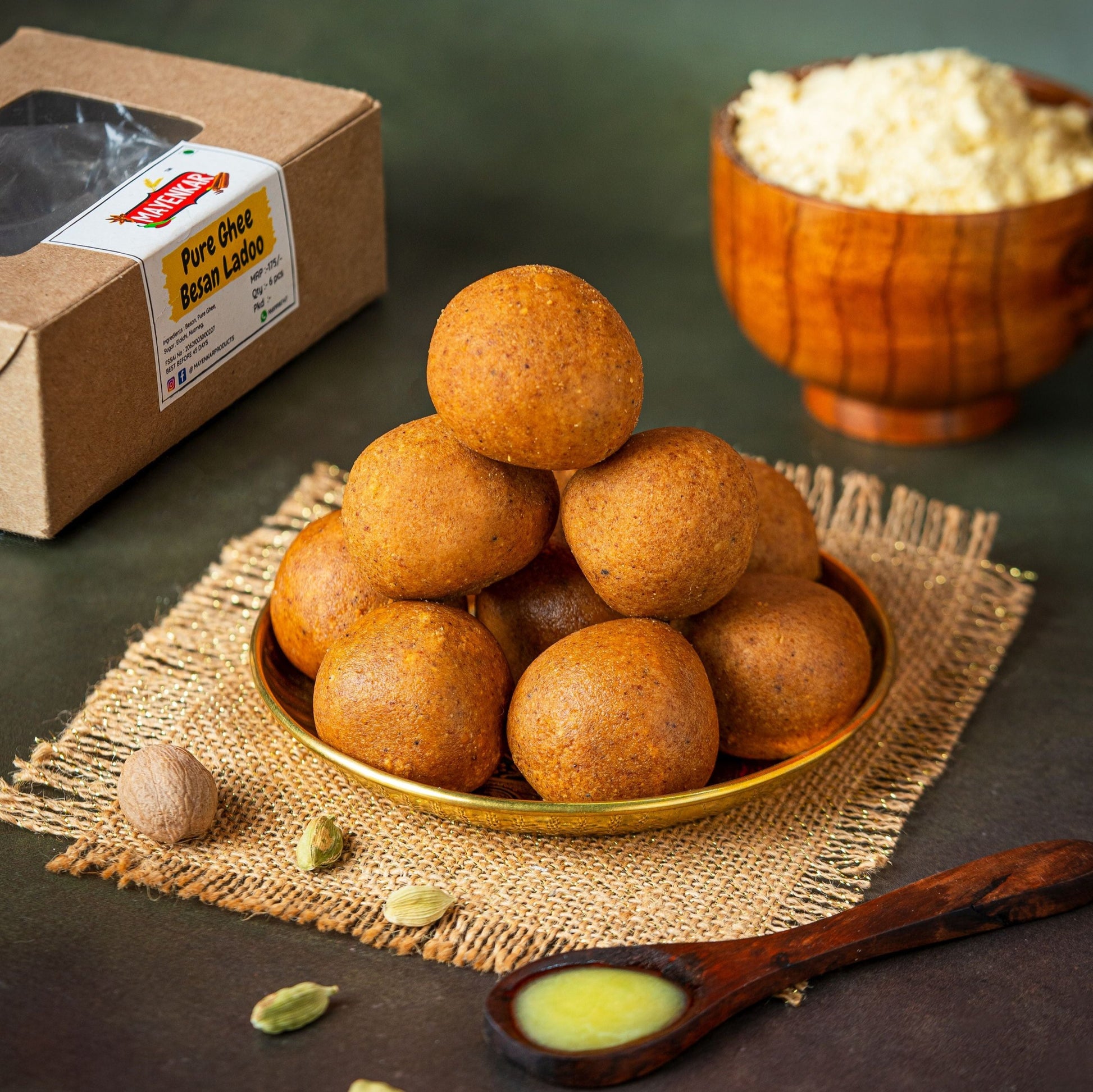 Hand-rolled Ladoos made using Besan flour and sweetened using Sugar.